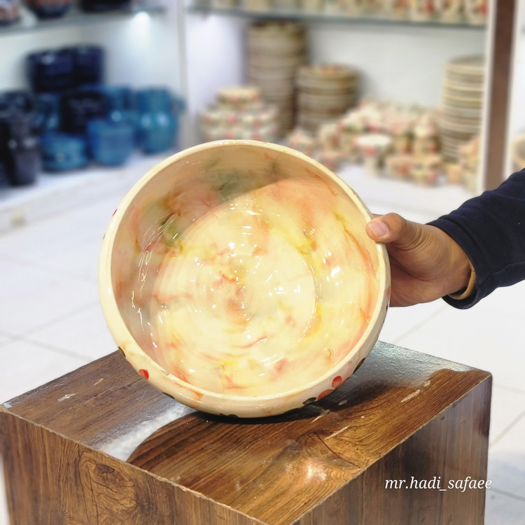 -نقوش روی ظروف در پخت سوم روی لعاب اعمال شده و تا دمای ۷۵۰ درجه پخت شده و ثابت میباشد