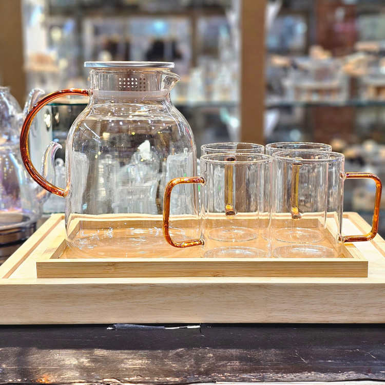 پارچ و لیوان پیرکس برند ناتالی با سینی بامبو درب استیل قالب اروپایی