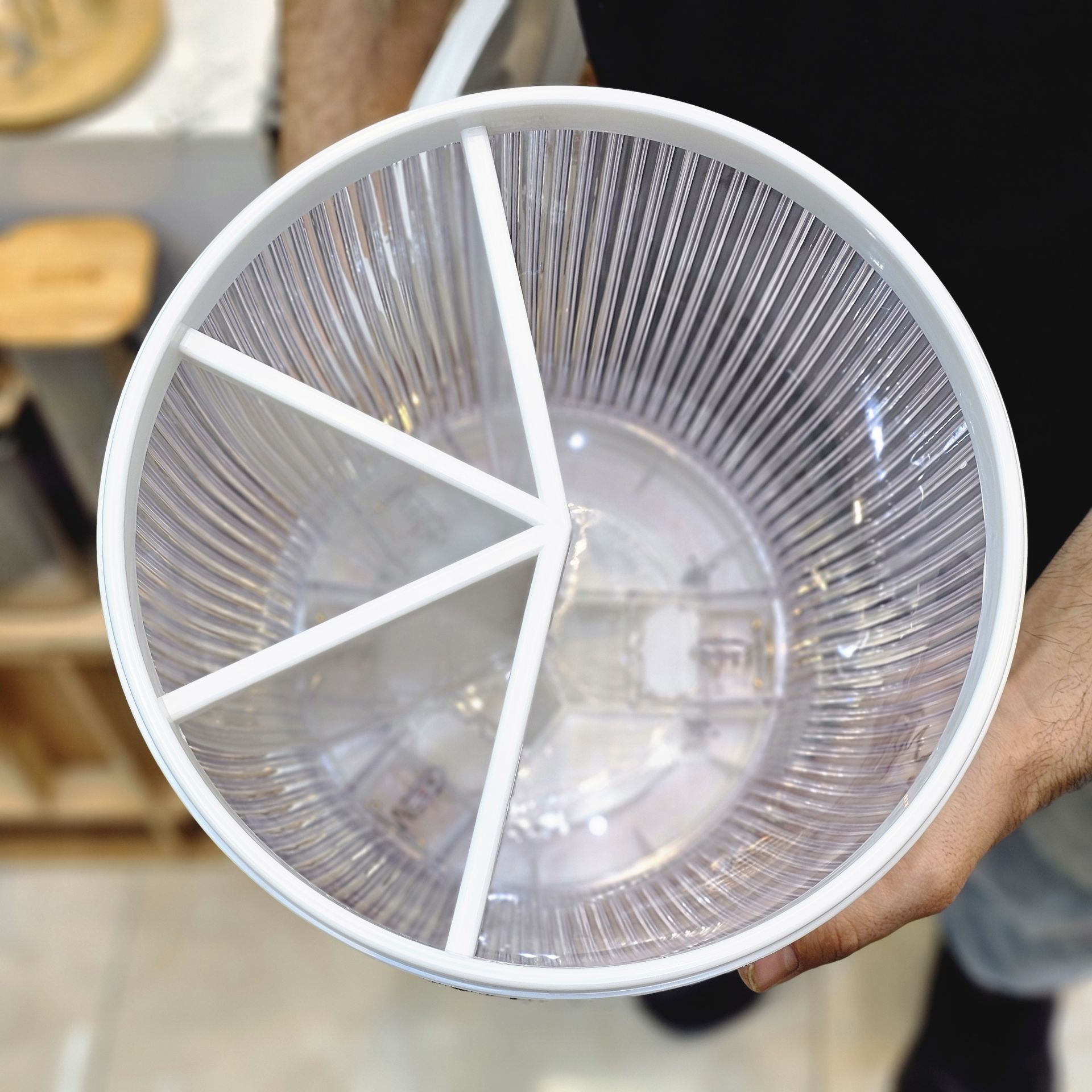 سطل برند و حبوبات اصلی بدنه اکرولیک تایوانی کد۳۳۲۷ توضیحات هر خانه دارای دکمه مجزا میباشد پیمانه دار دارای مخزل گردان دارای یک قسمت برنج ۵ کیلوگرمی دارای سه قسمت حبوبات ۱کیلو گرمی